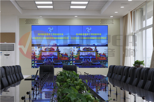 该项目位于校内行政楼5楼,会议室包括音频系统和视频显示系统。视频显示系统由9块46寸3.9mm超窄边拼缝的高清LED拼接屏组成,可实现四路、三路、两路、一路等不同信号源输入的信号在拼接屏上的不同显示模式(4路分屏模式、2路对比模式、1路全屏模式等),同时该项目还设置了墙面信息盒,可实现流动摄像机的图像上屏功能。