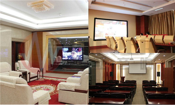 整体项目分为3个会议室和1个报告厅。报告厅采用阶梯式座椅设计,扩声系统依靠前置专业大功率全频喇叭和后置壁挂式补声喇叭组成。舞台上方安置了顶光灯,前方安装了面光成像灯,满足舞台演出和报告的灯光需求。