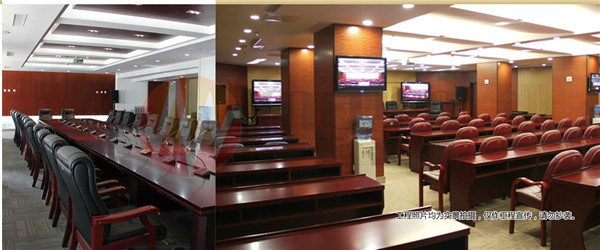 三个会议室的设计大致相近,均按照多功能数字化会议室的要求设计,不但能应对远程视频会议的考验,其高科技的办公会议模式也符合建设要求