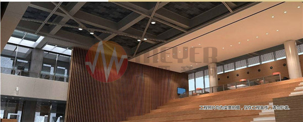 整体项目分为3个会议室和1个报告厅。报告厅采用阶梯式座椅设计,扩声系统依靠前置专业大功率全频喇叭和后置壁挂式补声喇叭组成。舞台上方安置了顶光灯,前方安装了面光成像灯,满足舞台演出和报告的灯光需求。
